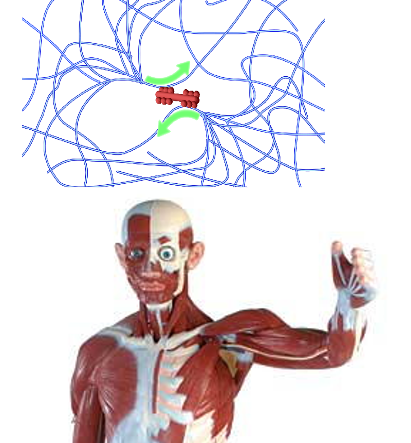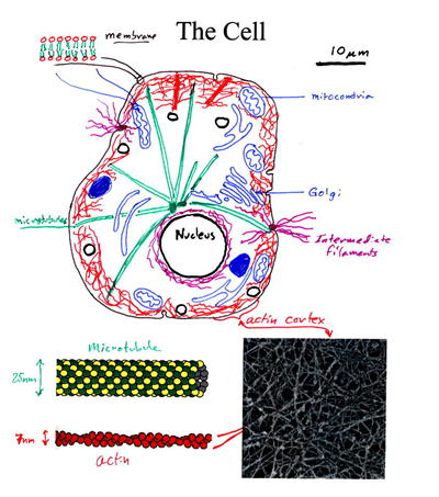 細胞内部には細胞骨格(アクチン、マイクロチューブル)と呼ばれる適当な剛性を持つ繊維状の蛋白質高分子があります。細胞骨格は細胞内部でネットワークを構成し、人体における骨格と同様に、細胞に力学的な安定性を与えます。この細胞骨格上で、モーター蛋白質(ミオシン、キネシン)がATPの加水分解に伴い形態を変させることで、細胞内部に力が発生します。これは人体において筋肉が果たす役割に似ています。