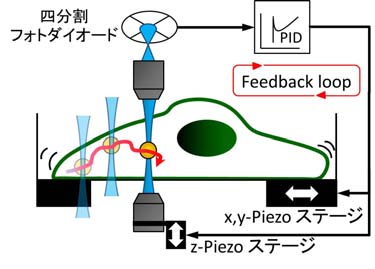 そこで私たちは、生きた細胞の中に微小な粒子を注入し、その粒子の揺らぎや外部からの力に対する応答を高精度で測定する方法を開発しました。細胞内部では細胞質流動と呼ばれる激しい動きが起きていますが、私たちはフィードバック制御を用いてその動きをリアルタイムで補正し、粒子の位置を常にナノメートル以下の精度で捉えることに成功しました(図3)。