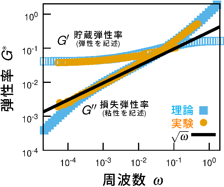 ソフトジャム固体とは、柔らかい粒子がランダムに詰まってできた物質で、液体と固体の中間のような性質を示します。産業製品にもよく使われ、日常生活の中にも数多く存在しながら、その力学的性質の本質はこれまで十分に理解されてきませんでした。中でも、外部からゆっくり力を加えた際に現れる「異常に大きな粘性損失」という現象は、従来の粘弾性理論では説明が難しく、長らく未解明の課題とされてきました。 この問題に取り組むために私たちは、マイクロレオロジーにより高密度エマルジョンの粘弾性測定を行いました。光学的な方法を用いて試料に埋め込んだ微粒子の熱揺らぎを高い時空間分解能で精密に計測しました。この実験により、ソフトジャム固体が持つ異常な粘弾性応答を、これまでにない高精度で定量的に捉えることができました(図1参照)。特に注目すべきは、粘性損失が周波数の0.5乗(∝ ω¹ᐟ²)に比例して増加するという明確なスケーリング則が観測された点です。このような非標準的な周波数依存性は、通常の粘弾性体では現れず、構造が乱れた材料に特有の動力学的応答であると考えられます。