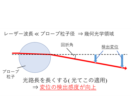 高分子ゲルなどのネットワークの力学特性をマイクロレオロジー計測する為には、ゲルの架橋点間距離よりも大きなスケールの計測粒子を用いる必要があります。しかしながらレーザー干渉法を用いたマイクロレオロジー計測の場合、レーザー波長よりも計測用粒子径が大きな幾何光学領域では、レーザーの計測感度が下がり、計測精度が低下してしまいます。そこで、私たちは光てこを用いることで、計測用コロイド粒子径の増大による計測感度低下を抑えた光学系を設計しています(図11,12)。また、補償光学を組み込むことで、光学的に不均一な試料下での高い計測感度の実現化も目指しています。